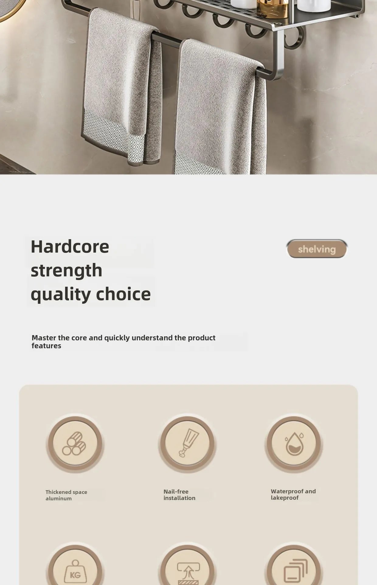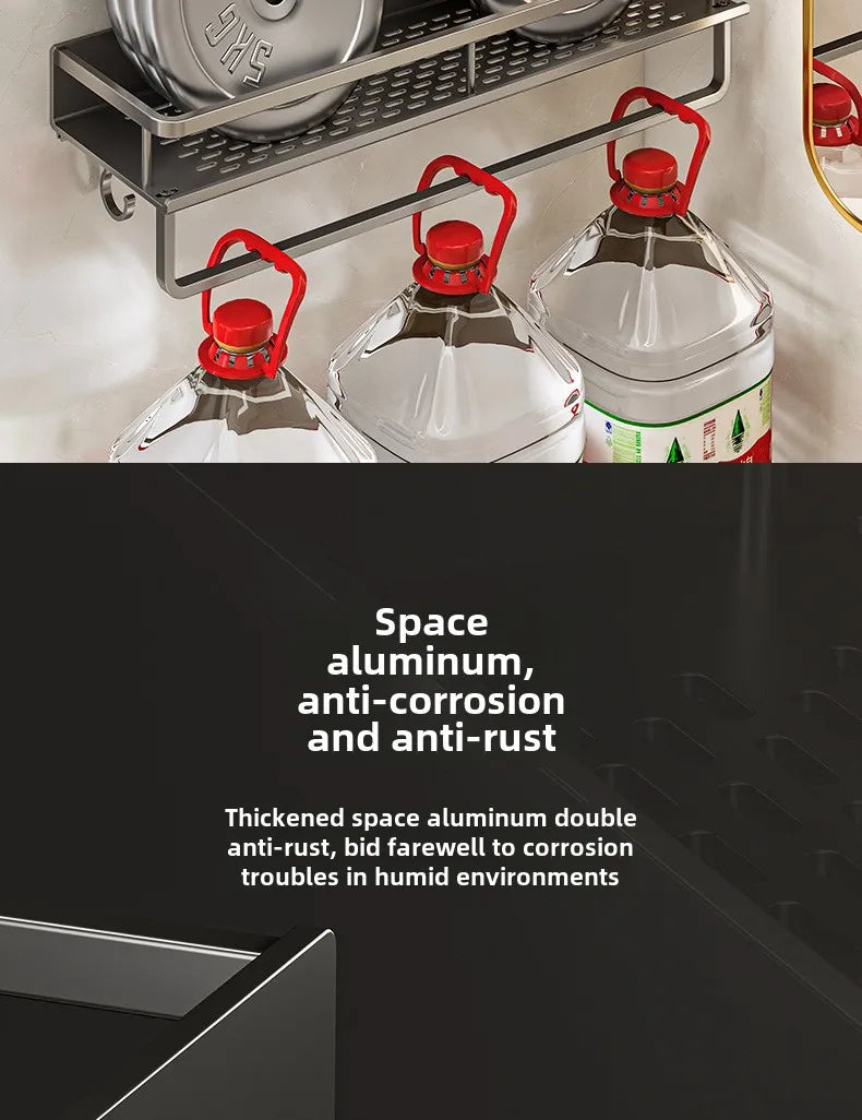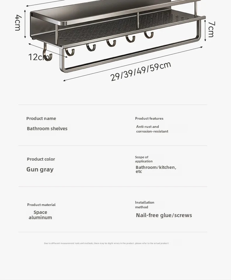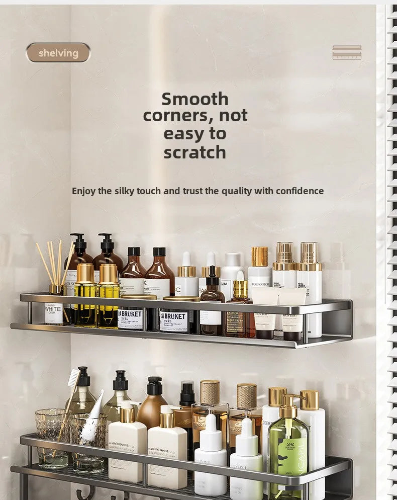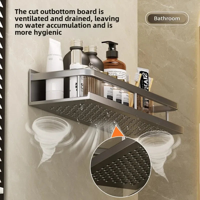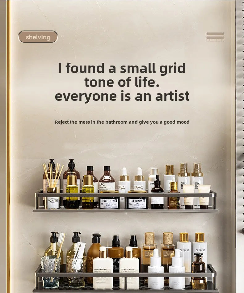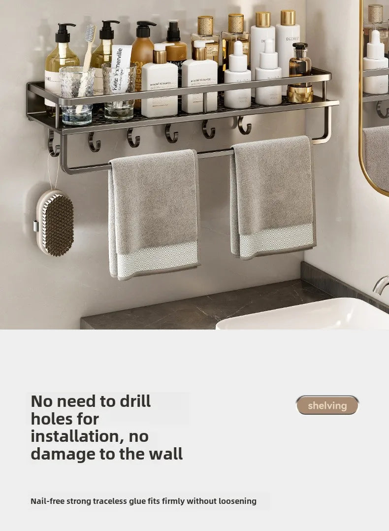 Bathroom storage rack, non perforated washbasin, hand washing and shower area, shower gel wall storage rack