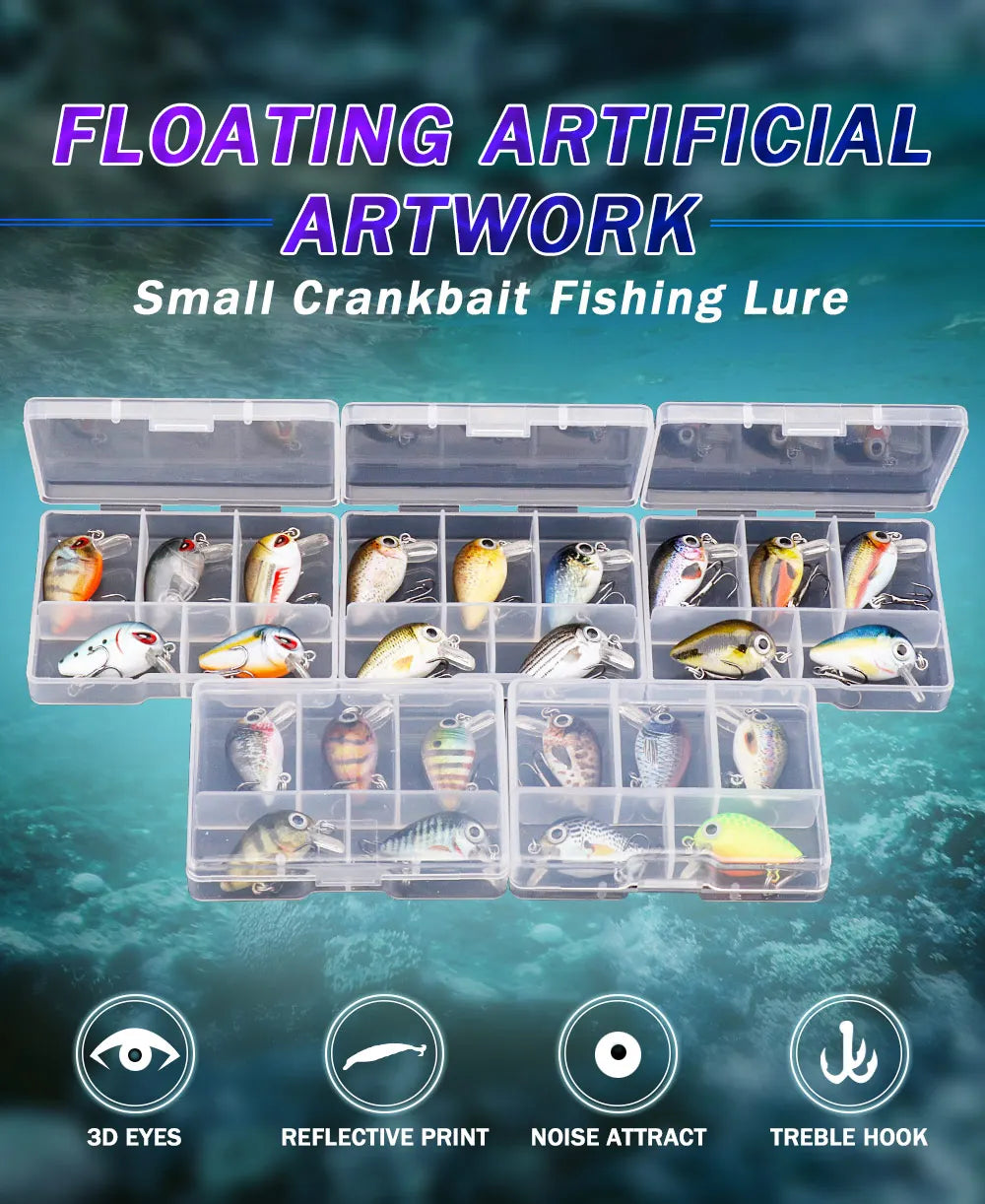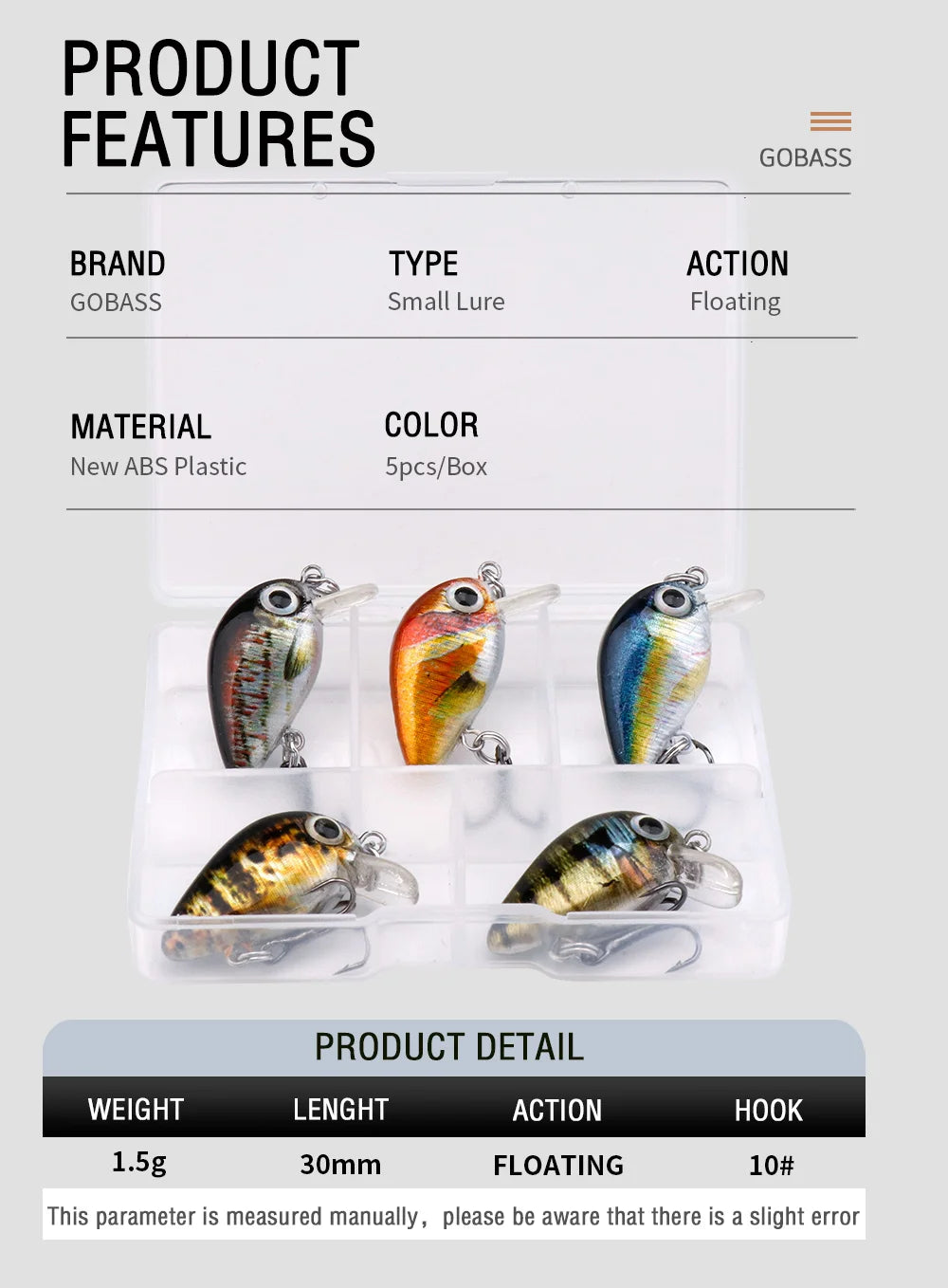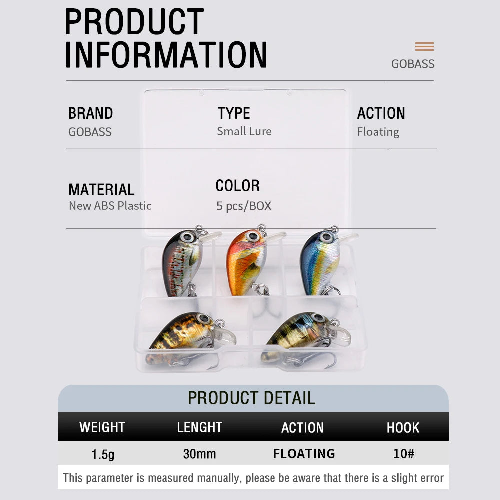 GOBASS 5pcs Mini Fish Bass Fishing Lure Set 3cm 1.5g Mini Artificial Baits Topwater Crank Wobblers For Pike Crankbaits Fishing