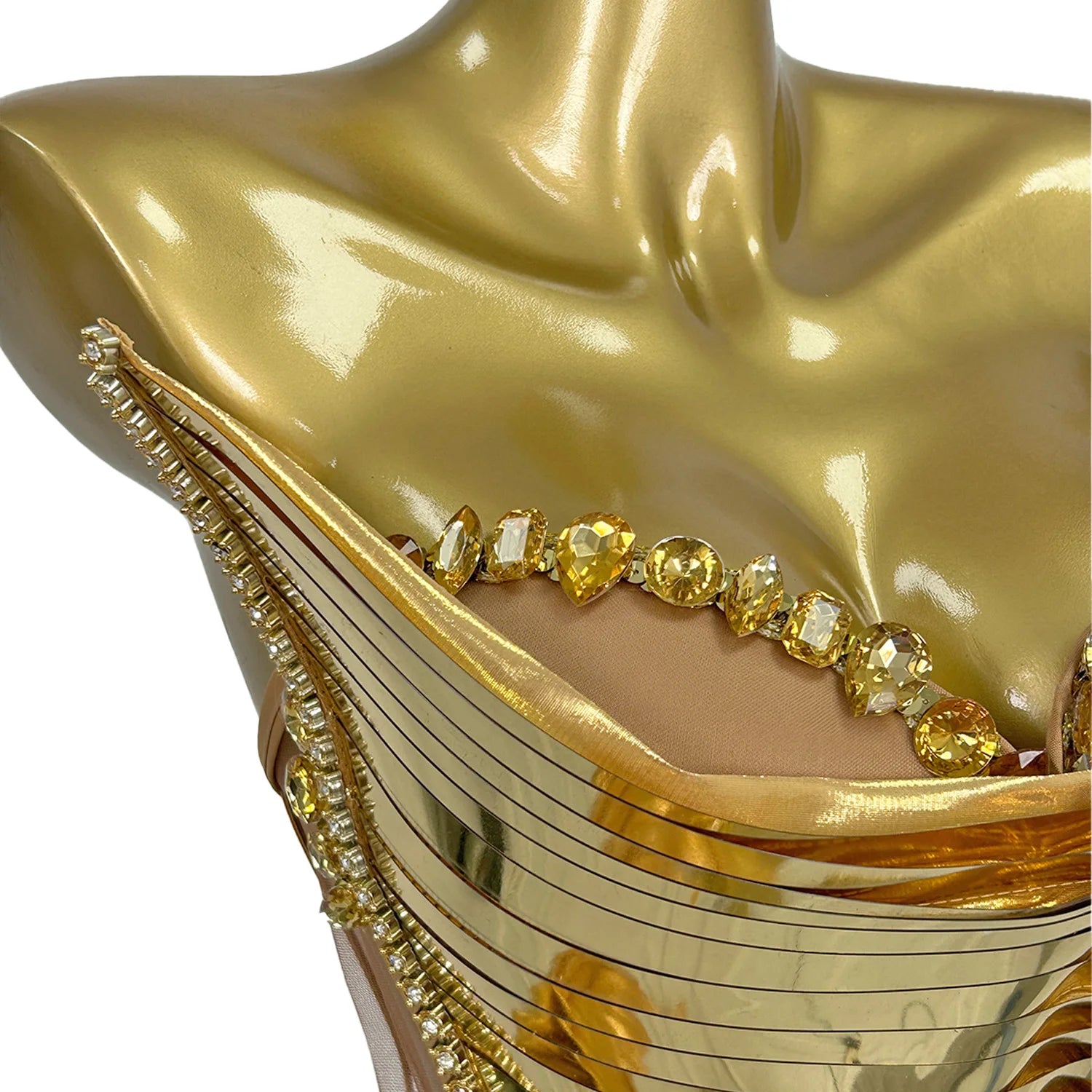 Gold Lens Design Tight Fitting Prom Dress Women Sexy Off-Shoulder Top and Skirt Set Nightclub Bar Performance Clothing Douniu