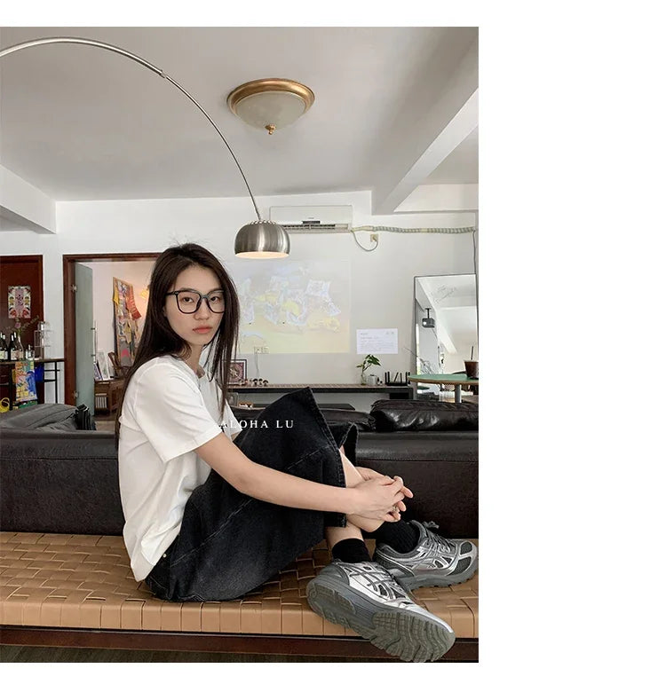 Harajuku Vintage High Waist Black Retro Washed Denim Shorts Women's Fashion Casual Loose Fit Y2K Streetwear Mid Long Short