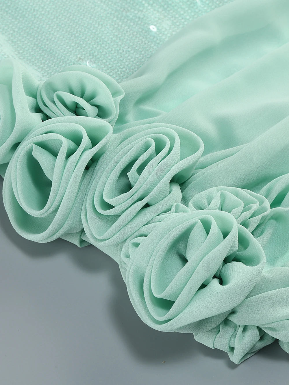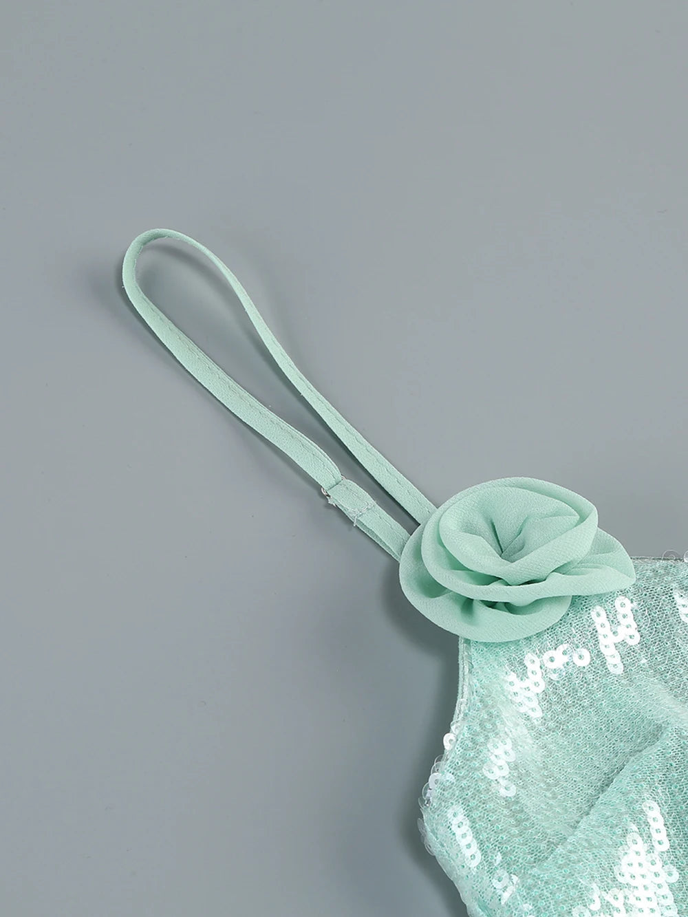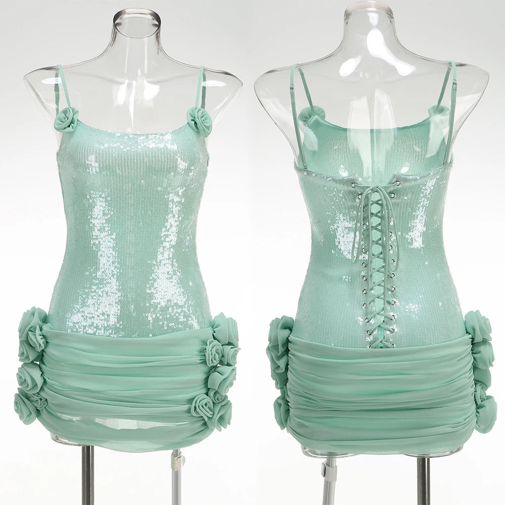 Sequin Sparkly Sexy Mini Dress Sleeveless Backless Tie Up Flower Ruched Prom Dresses Cocktail Evening Gown Wedding Guest Dress