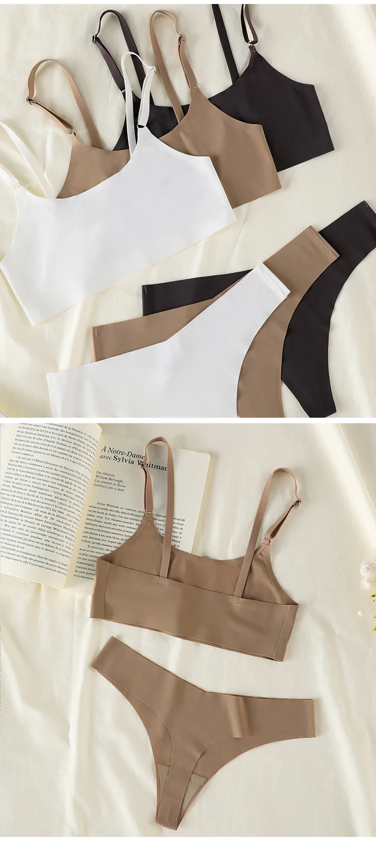 Hot Sale High Quality Latest Design Us Size Stylish Solid Ice Silk Seamless Wireless Bras And Women Underwear Set
