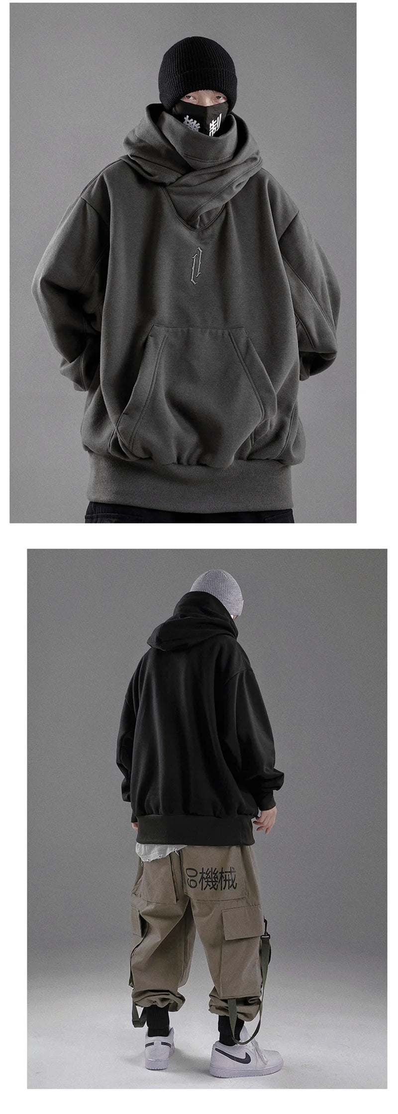 Embroidery Turtleneck Sweatshirt For Men Japanese Ninja Hoodies Autumn Hip Hop Fleece Pocket Streetwear Oversized Y2K Hoody